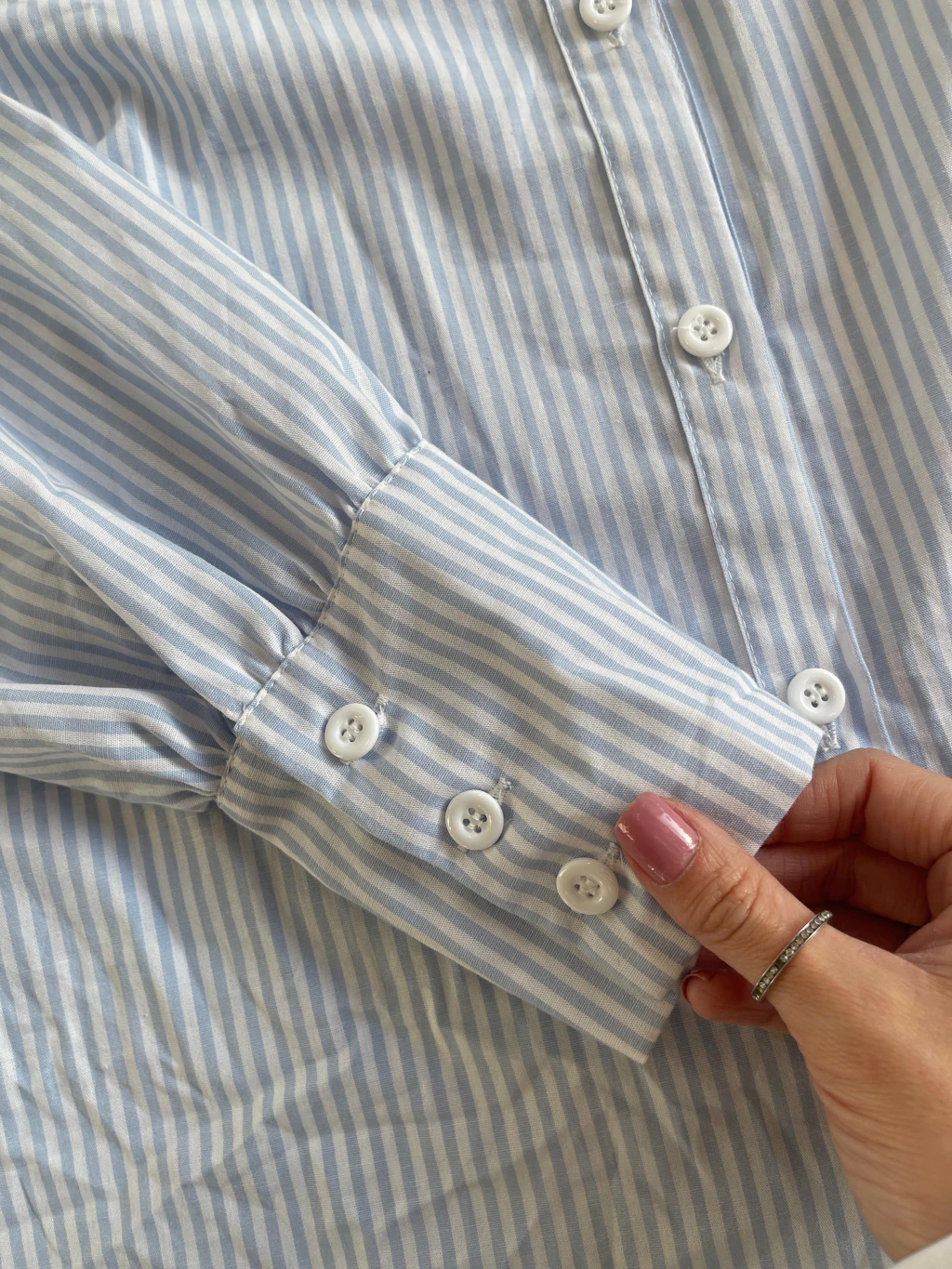 Com estampa de listras verticais em azul claro e branco, ela traz um visual clássico e alongado. A modelagem é reta, com caimento impecável, gola tradicional e fechamento frontal por botões. Os punhos têm detalhe de abotoamento triplo, que adiciona sofisticação ao acabamento.